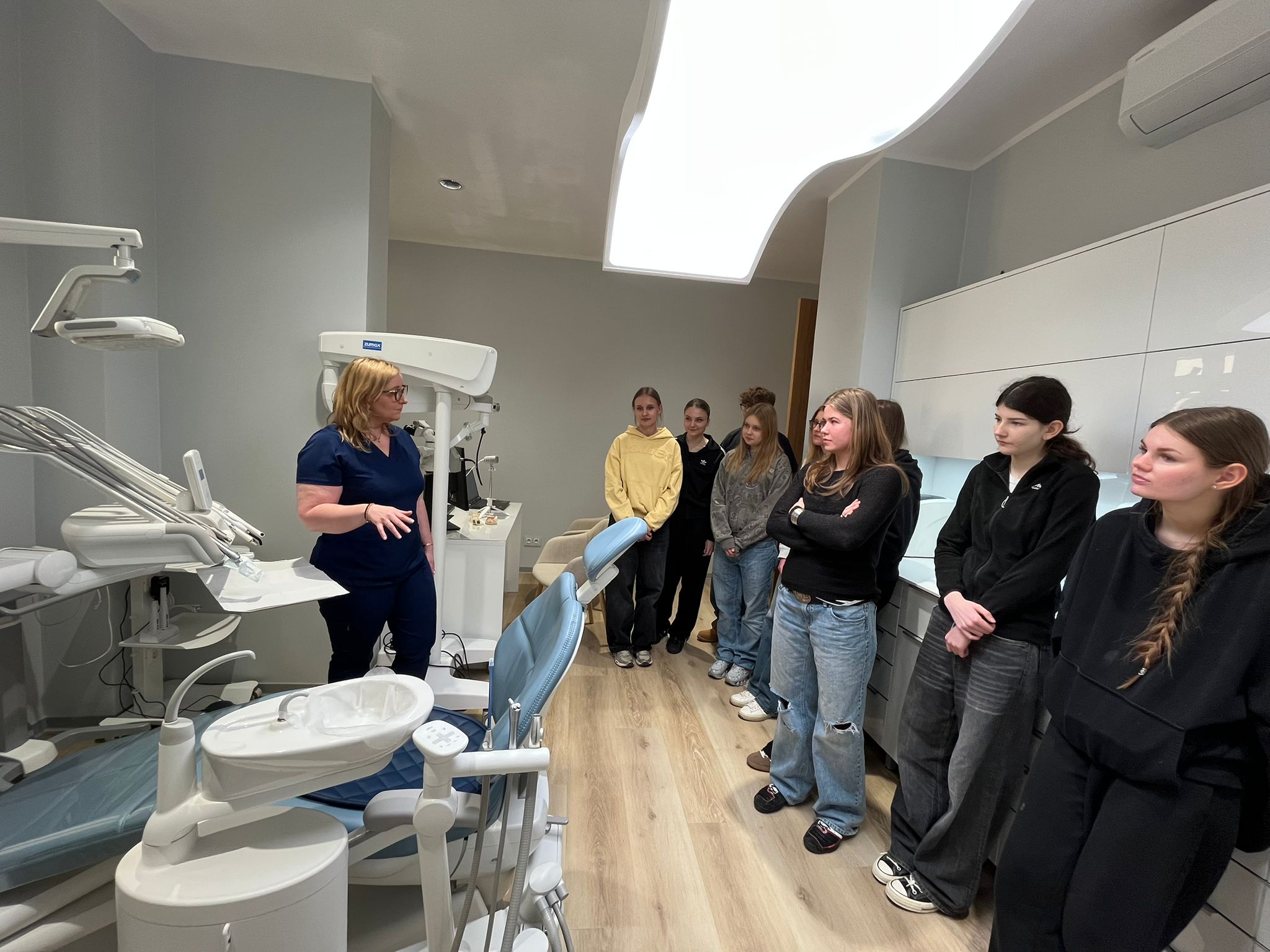 Podczas wizyty uczniowie rozpoczęli od wprowadzenia do zawodu lekarza stomatologa, poznając cele pracy oraz zasady bezpieczeństwa, w tym zagadnienia związane ze sterylizacją i zapobieganiem zakażeniom krzyżowym. Następnie omówiono rolę stomatologa i całego personelu medycznego w profilaktyce zdrowia - zwracając uwagę m.in. na wpływ diety, napojów energetycznych i używek na stan jamy ustnej, a także na aktualne doniesienia dotyczące wirusa HPV.