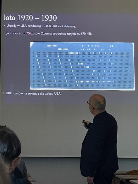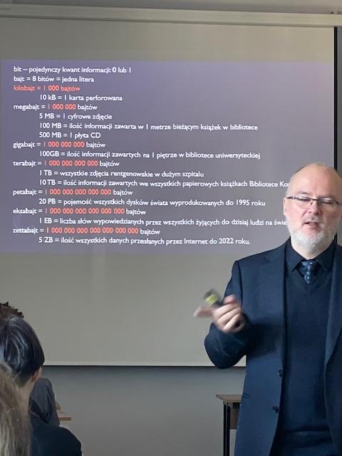 Wykład prowadził dr hab. Krzysztof Najman, prof. UG, który przybliżył nam informacje związane z "tłokiem w świecie cyfrowym", nadmiarowością danych, wyborem tych wartościowych informacji.